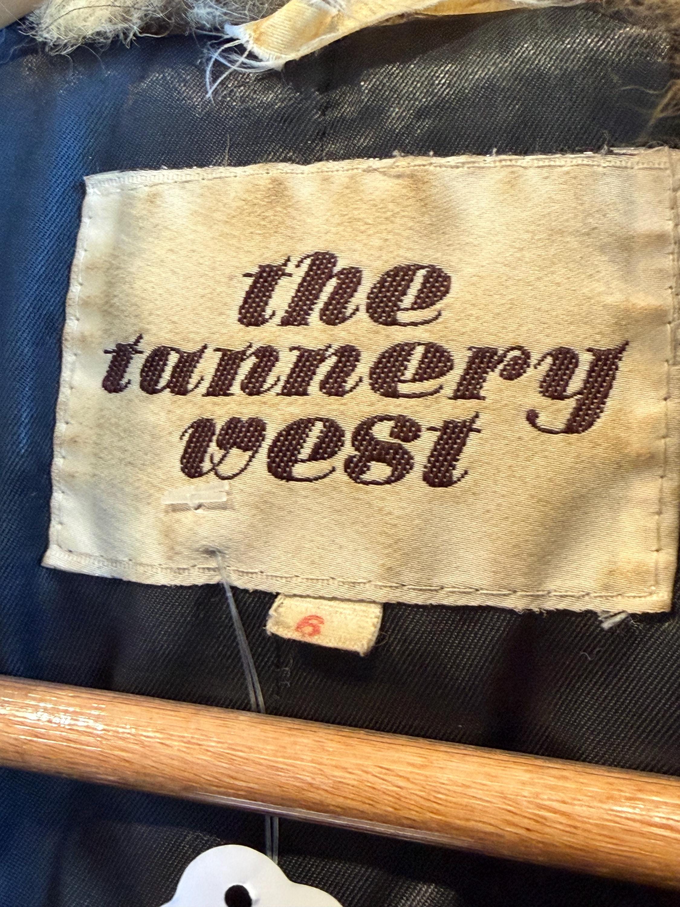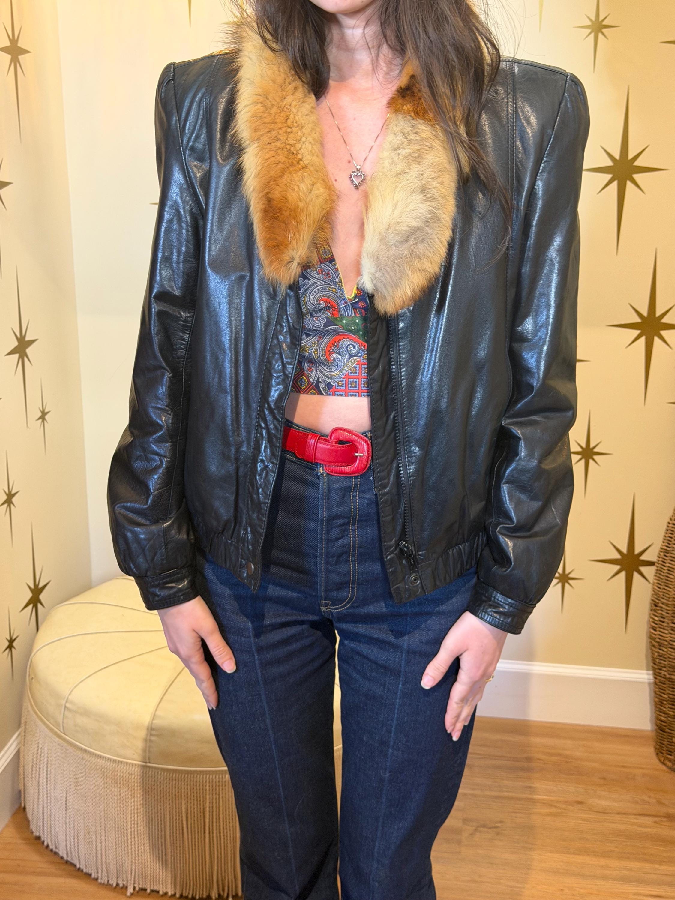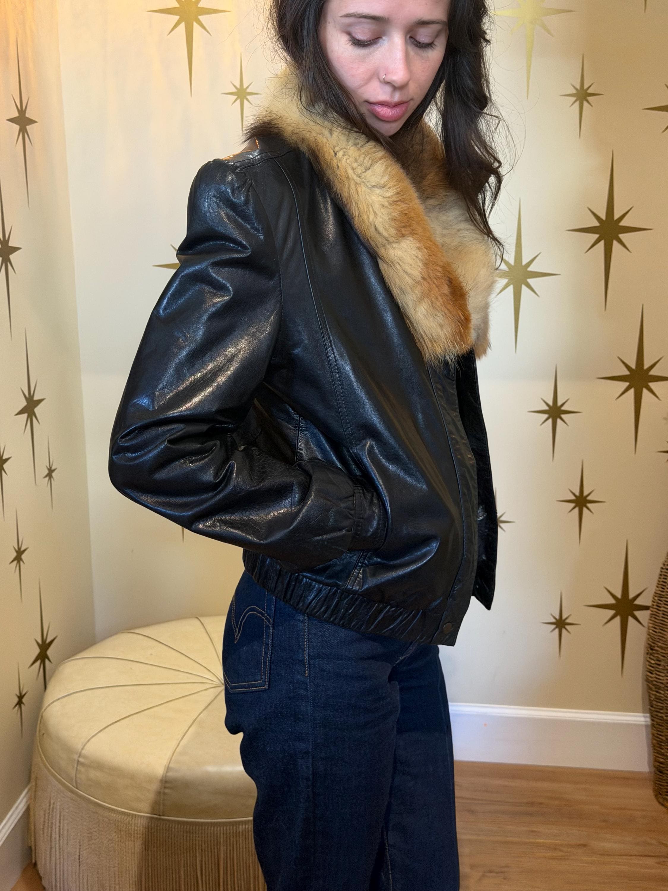 Amazing 1980s tannery west black leather short jacket with fur collar
