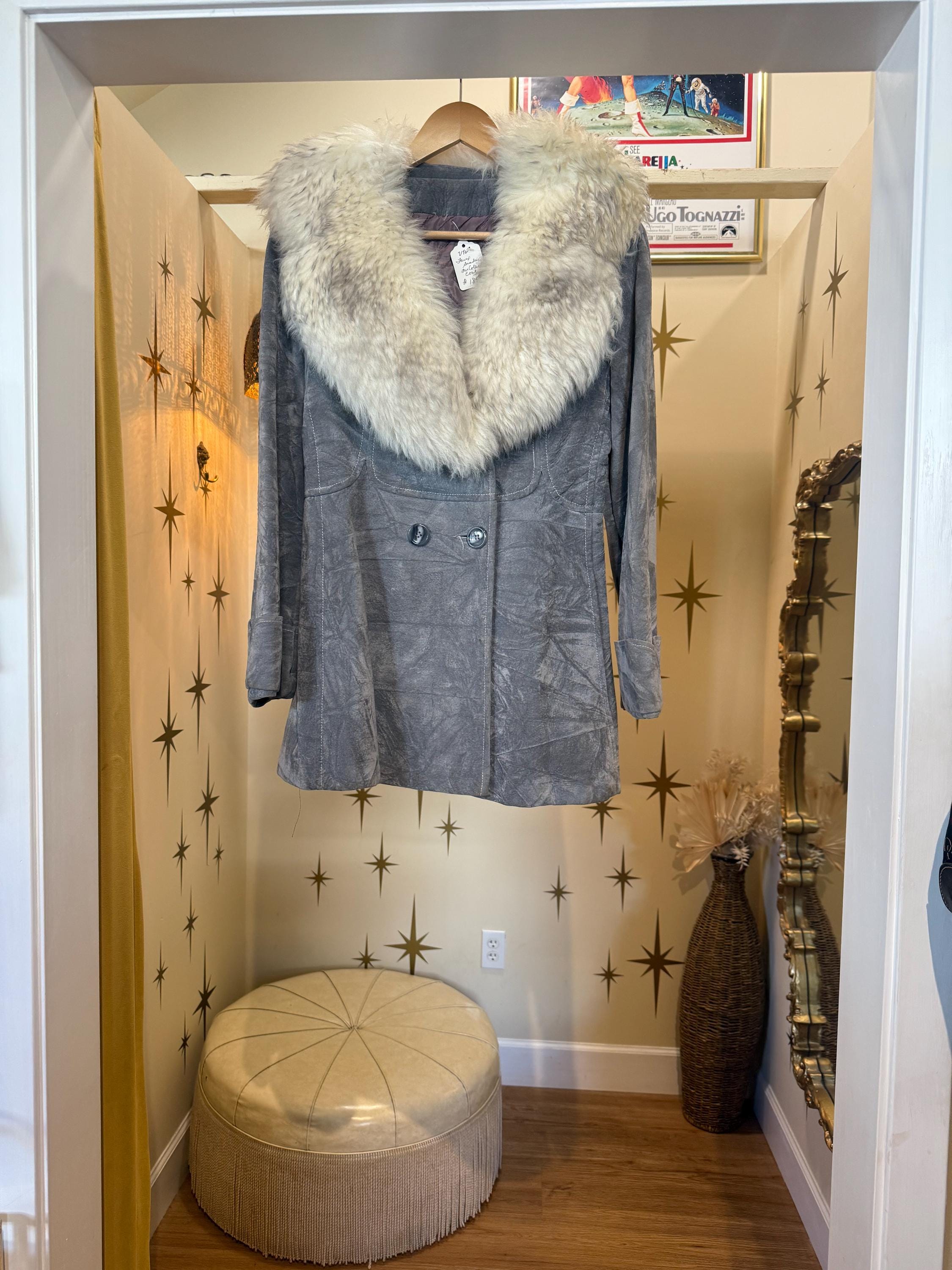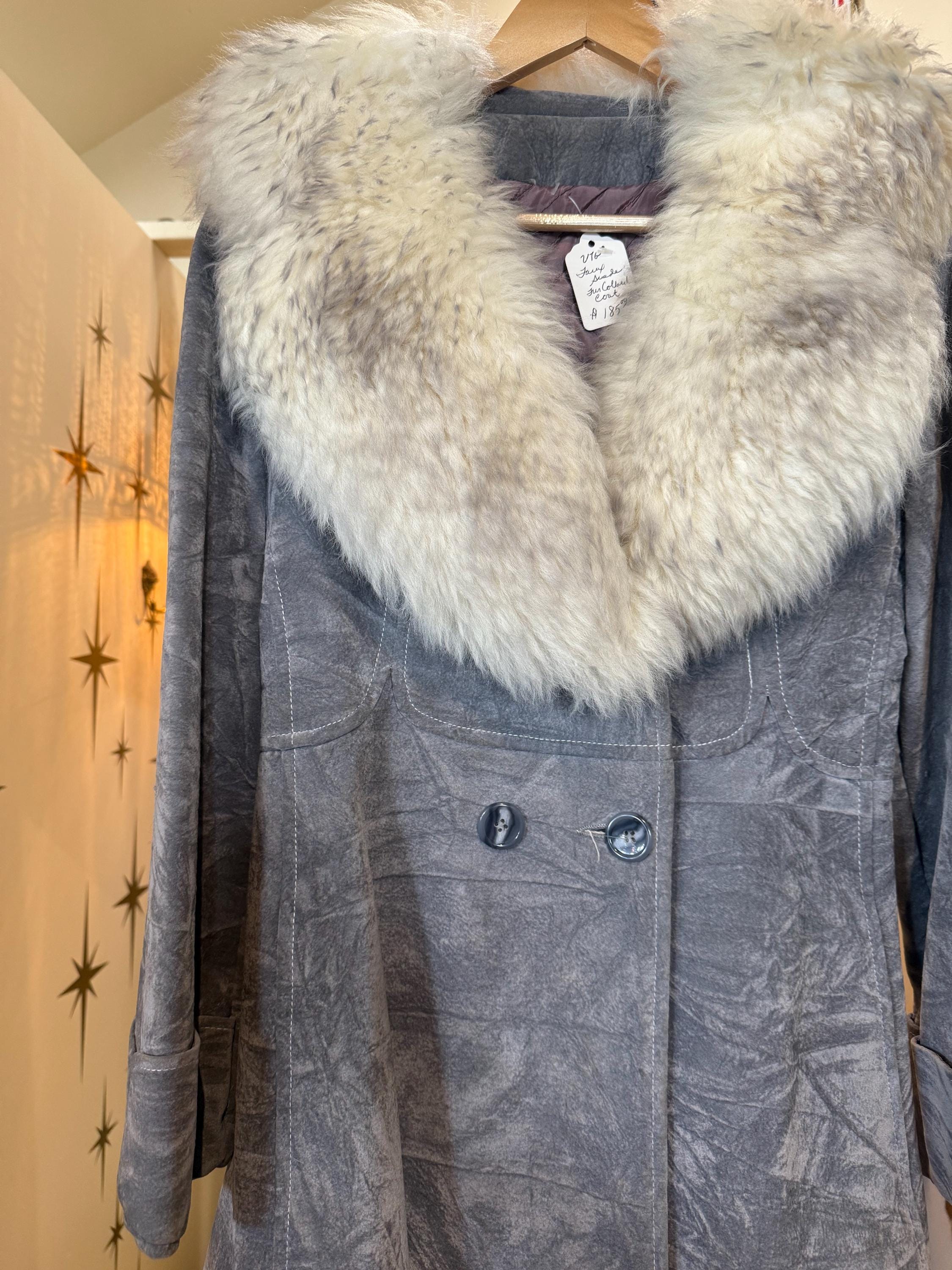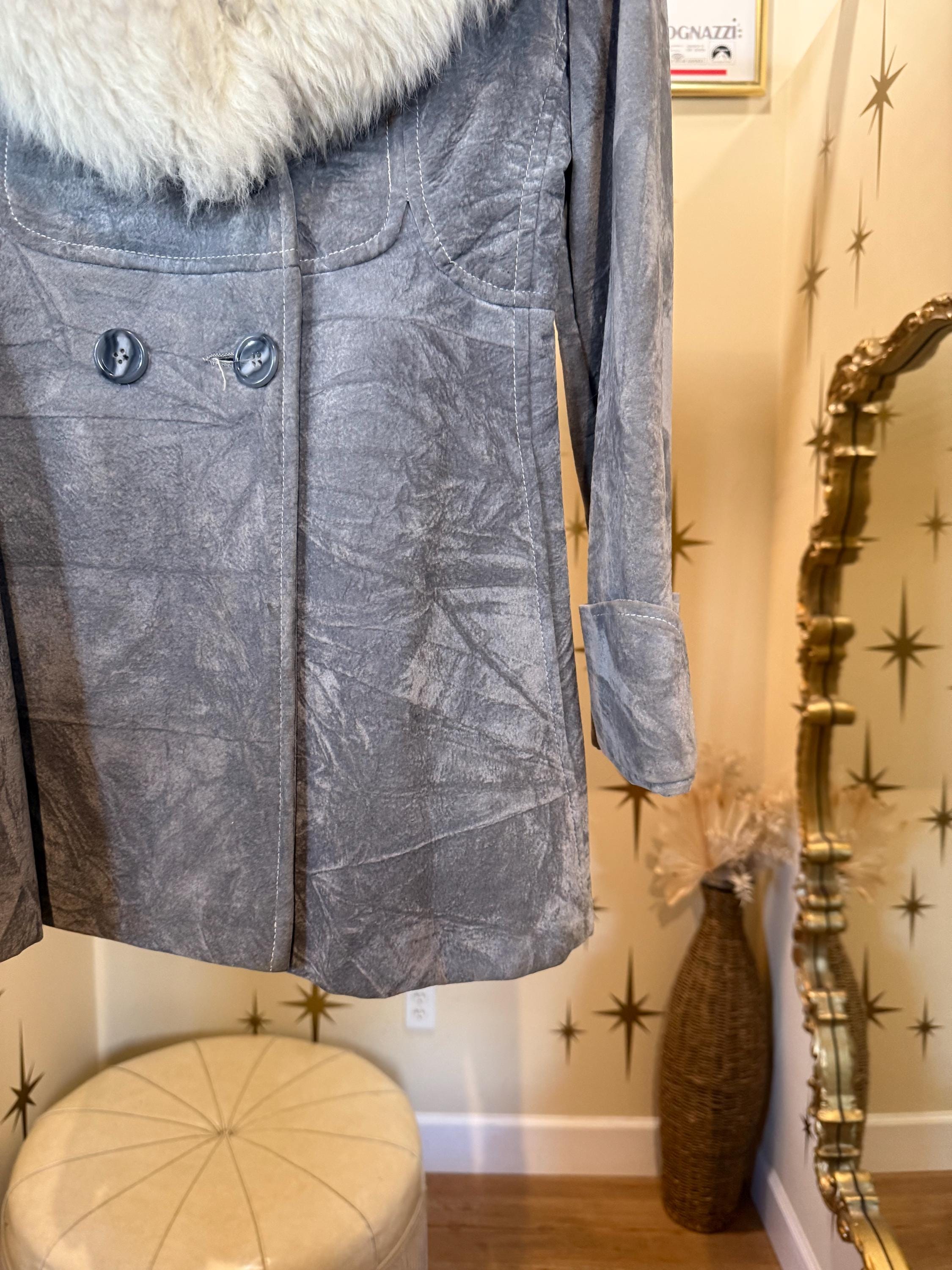 Amazing vintage blue/gray faux suede jacket with Sherpa fur collar