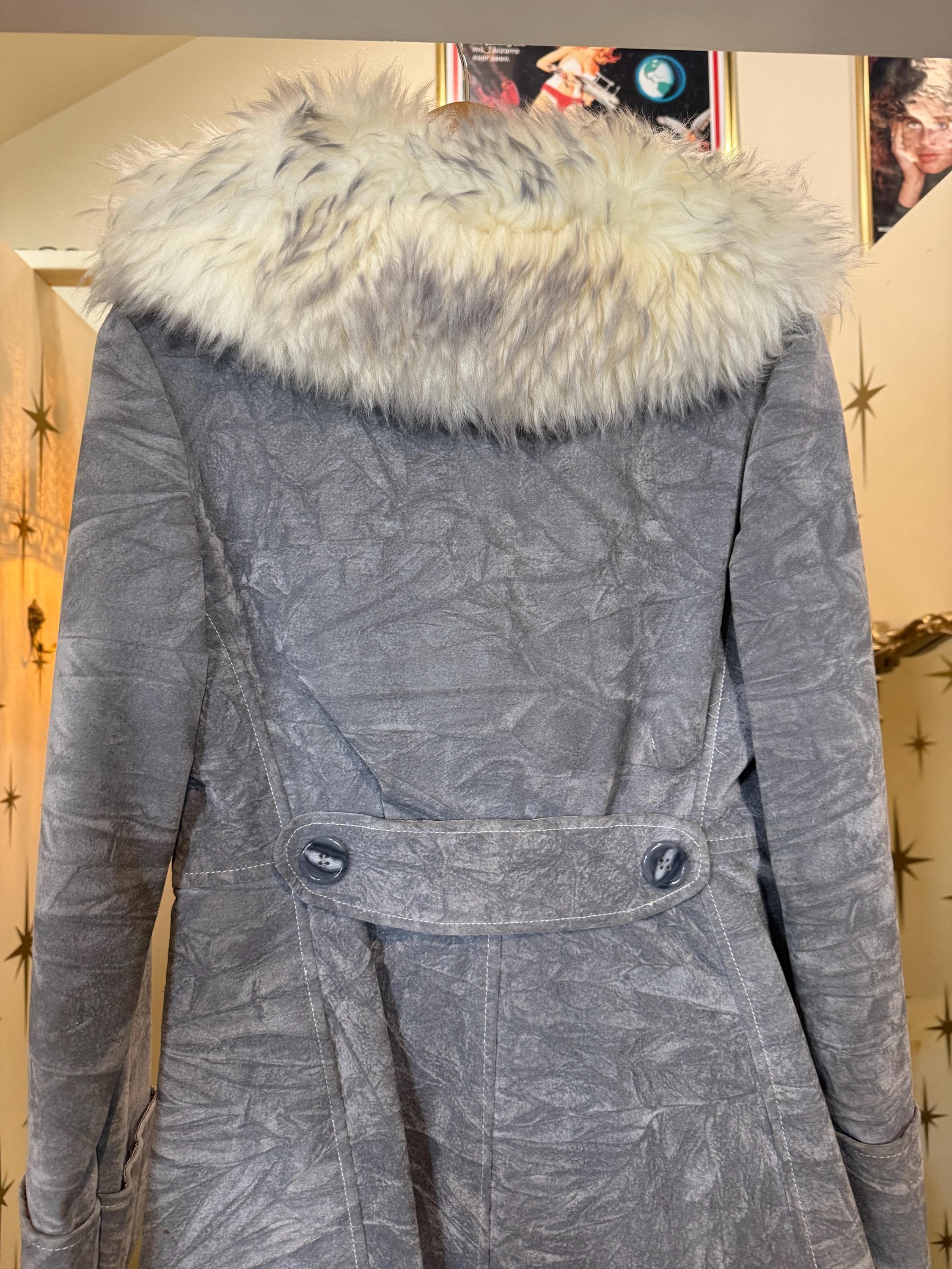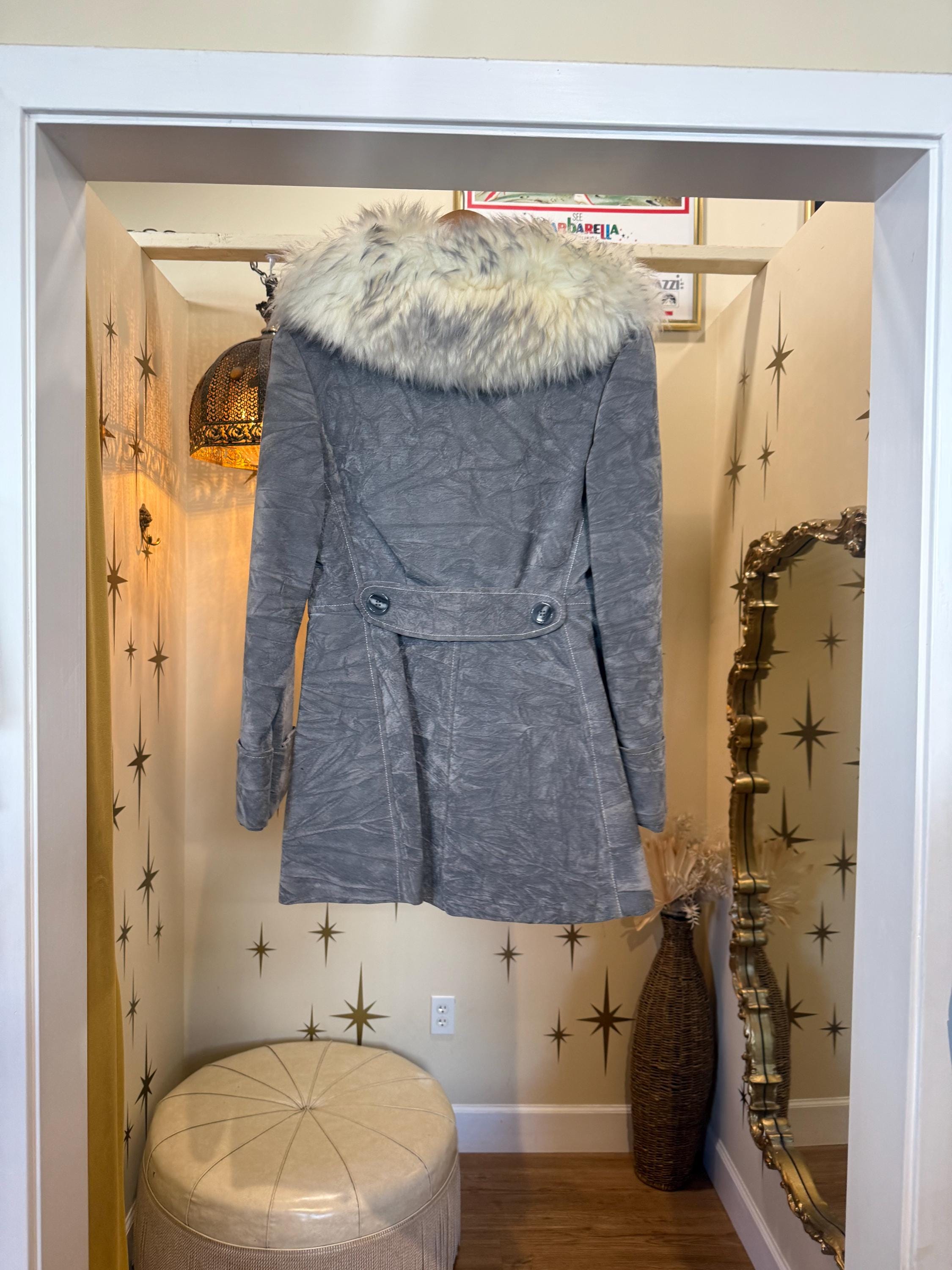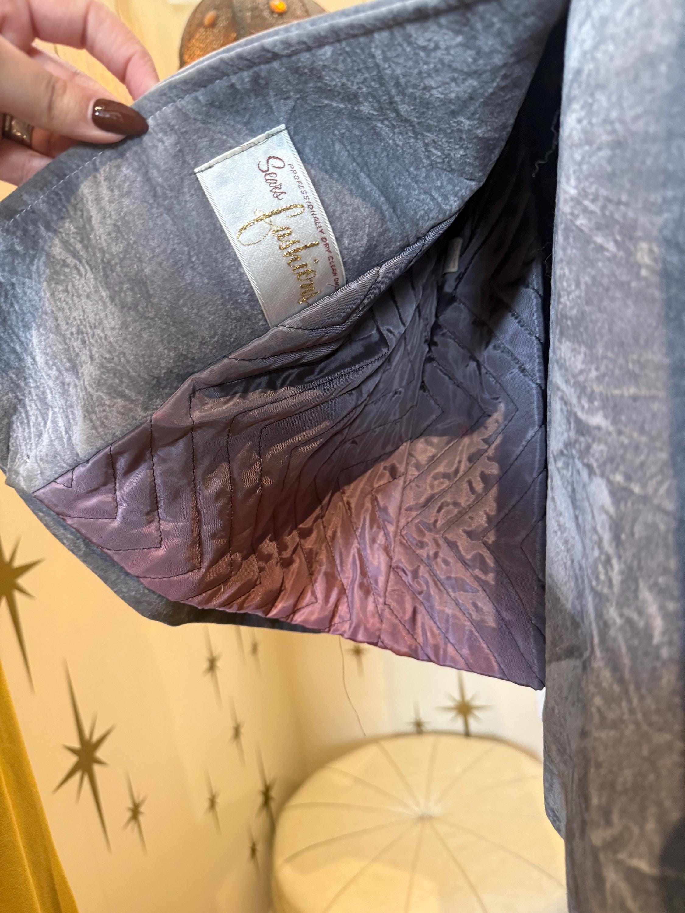 Amazing vintage blue/gray faux suede jacket with Sherpa fur collar