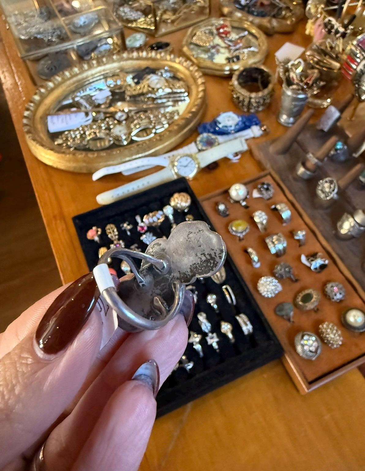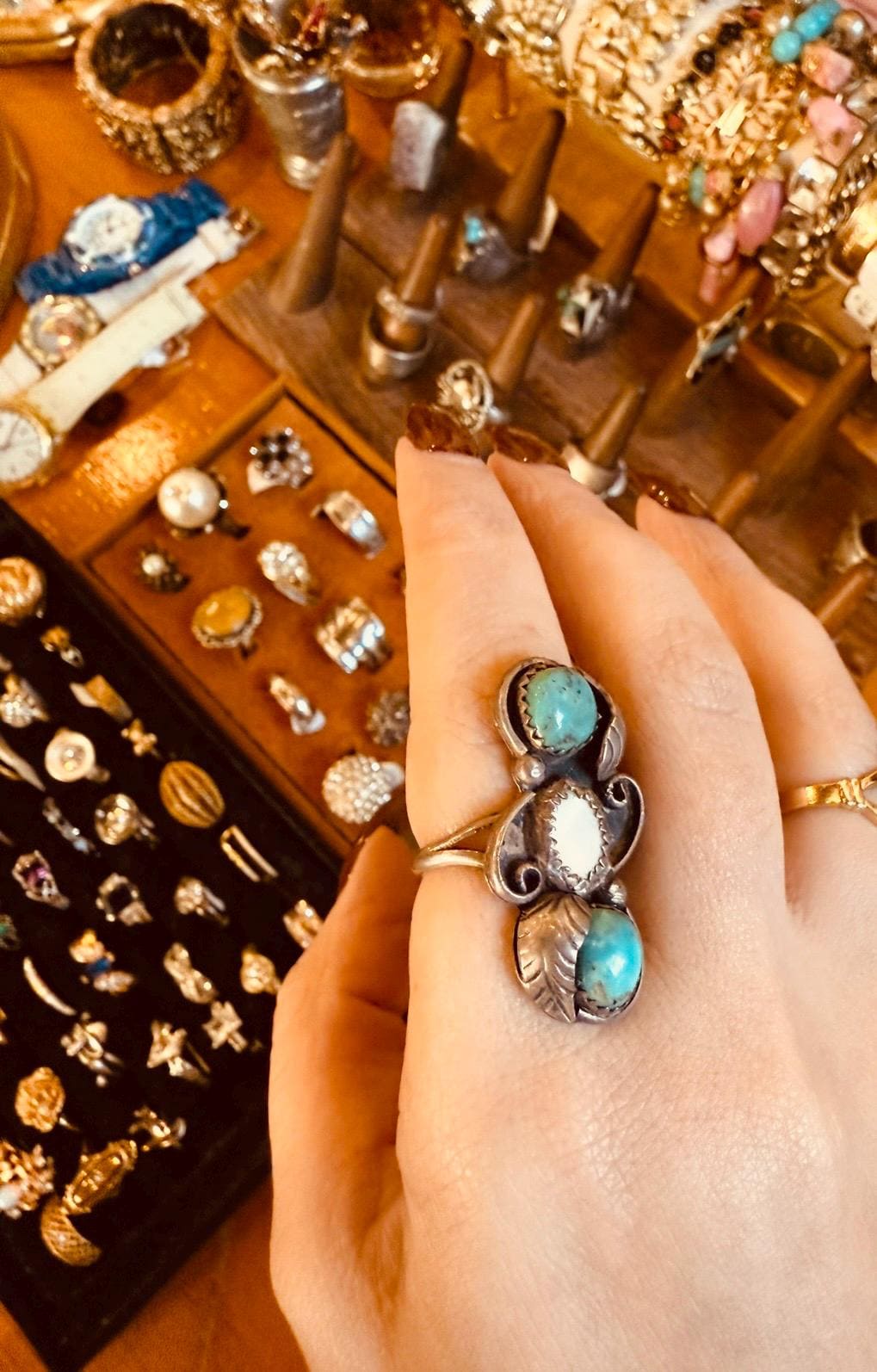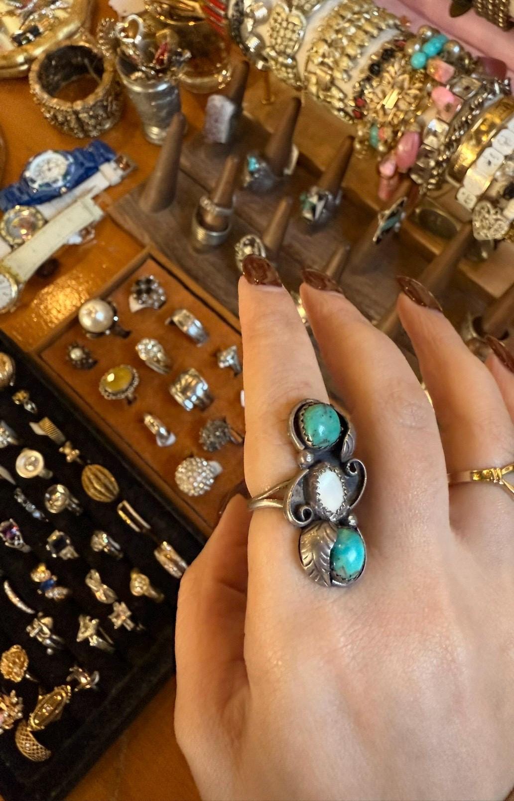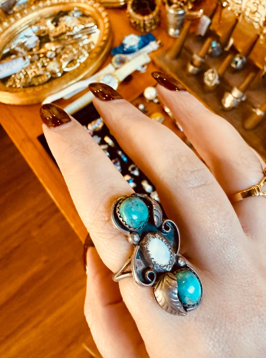 Gorgeous vintage silver ring with turquoise and mother of pearl stones