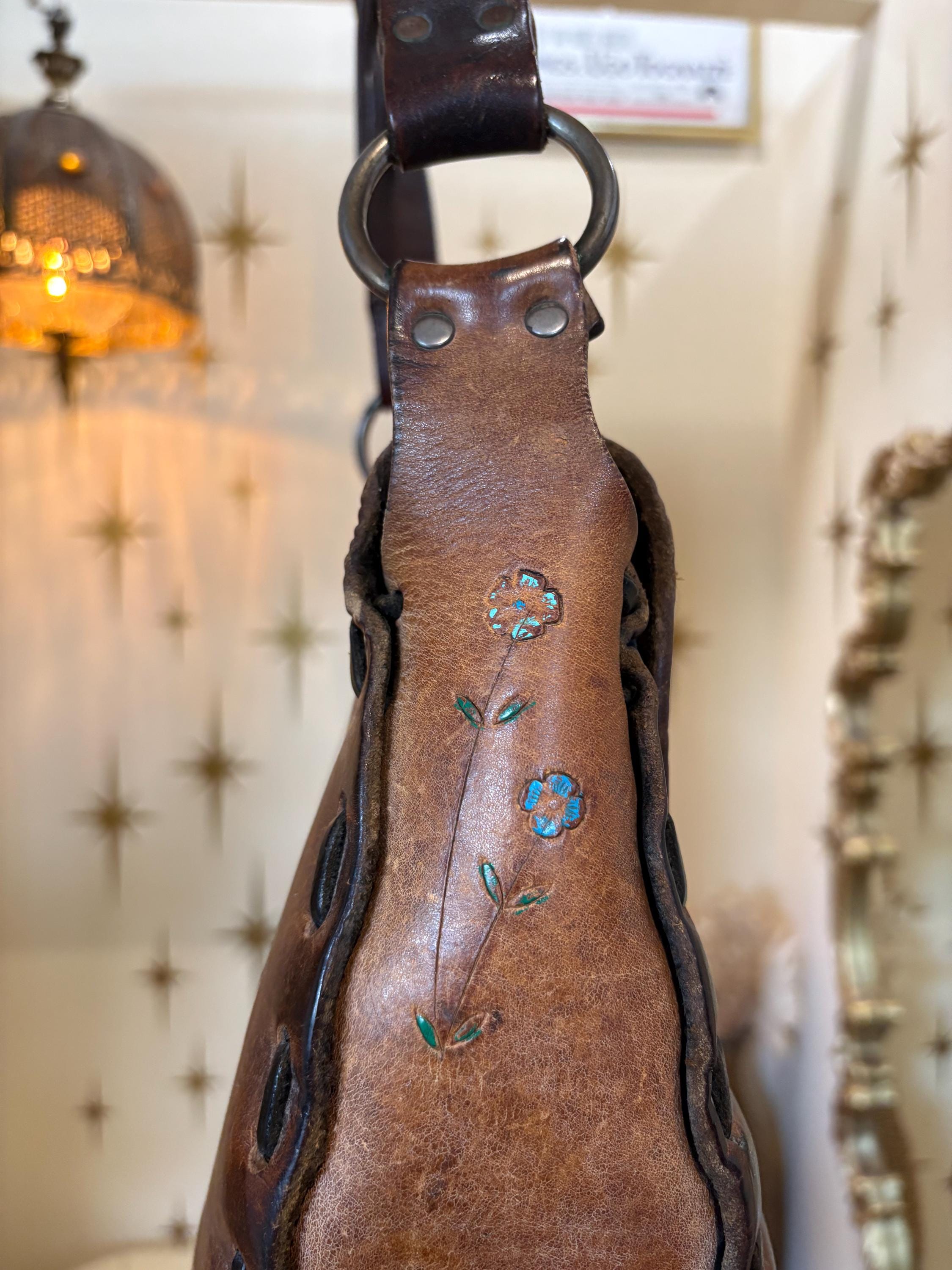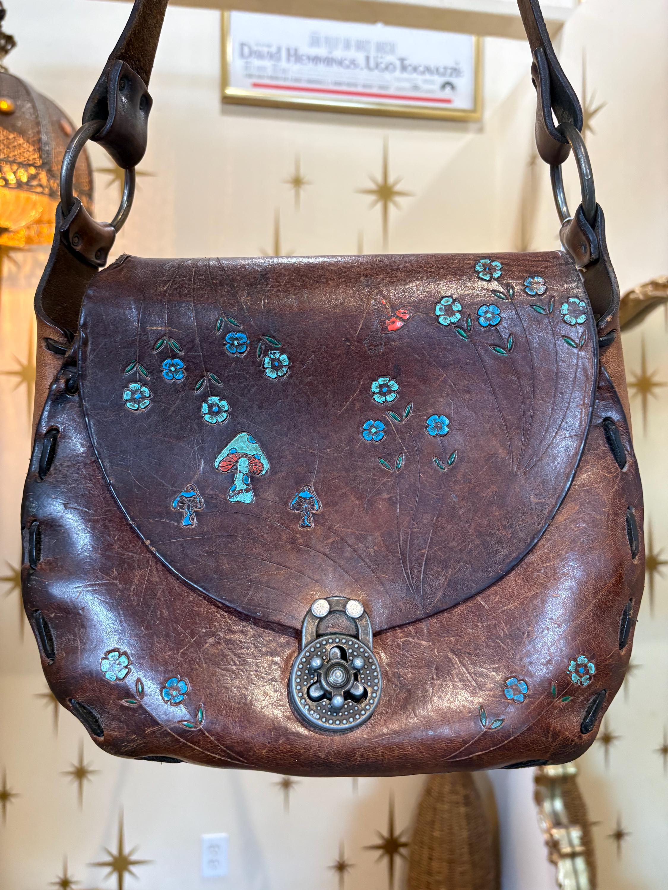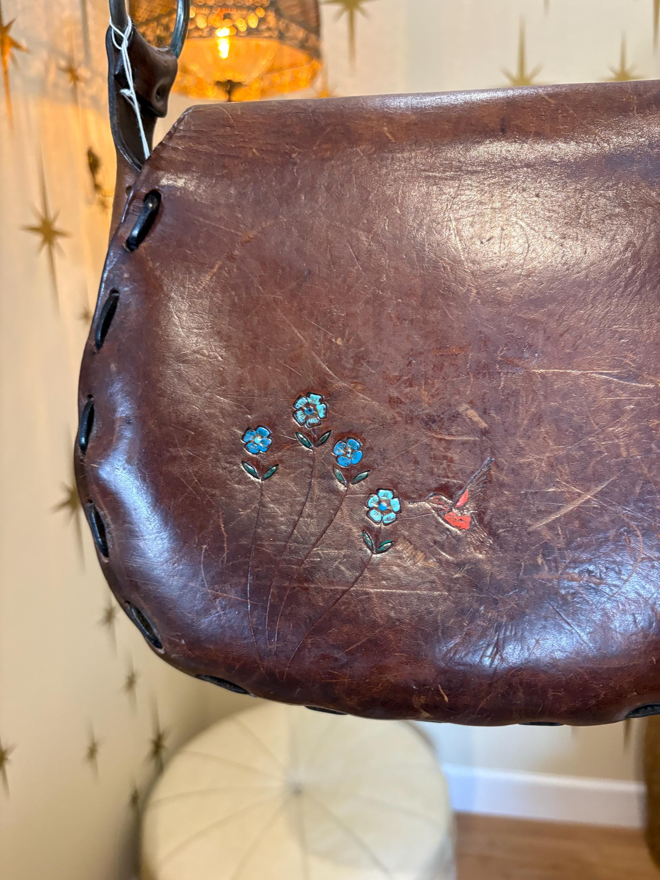 Very rare 1970s hand tooled purse with hand painted flowers and hummingbirds braided leather strap and spin lock. Amazing !!