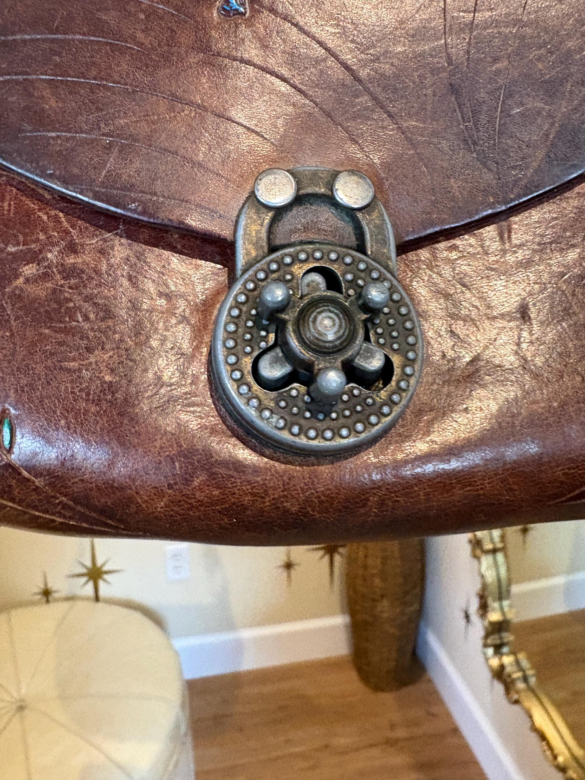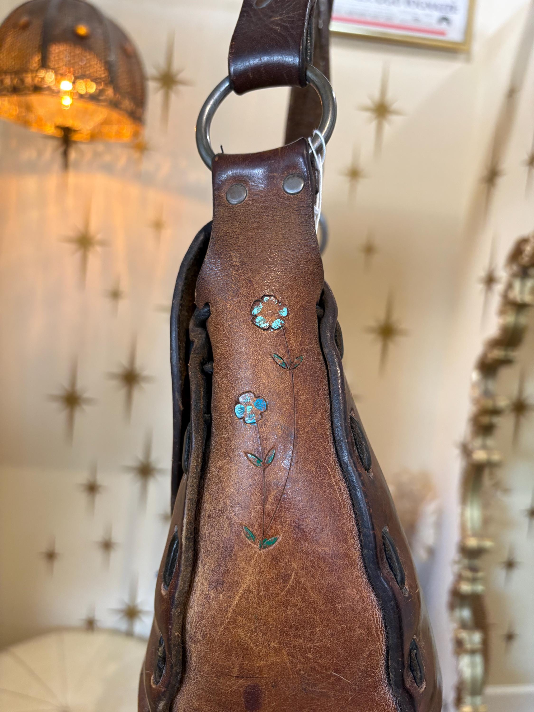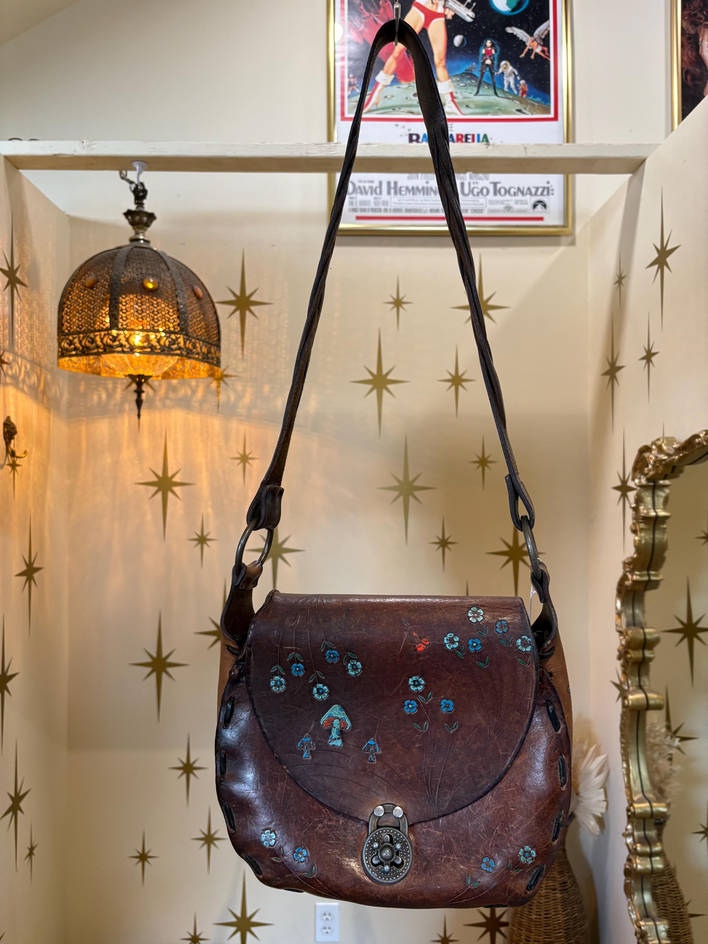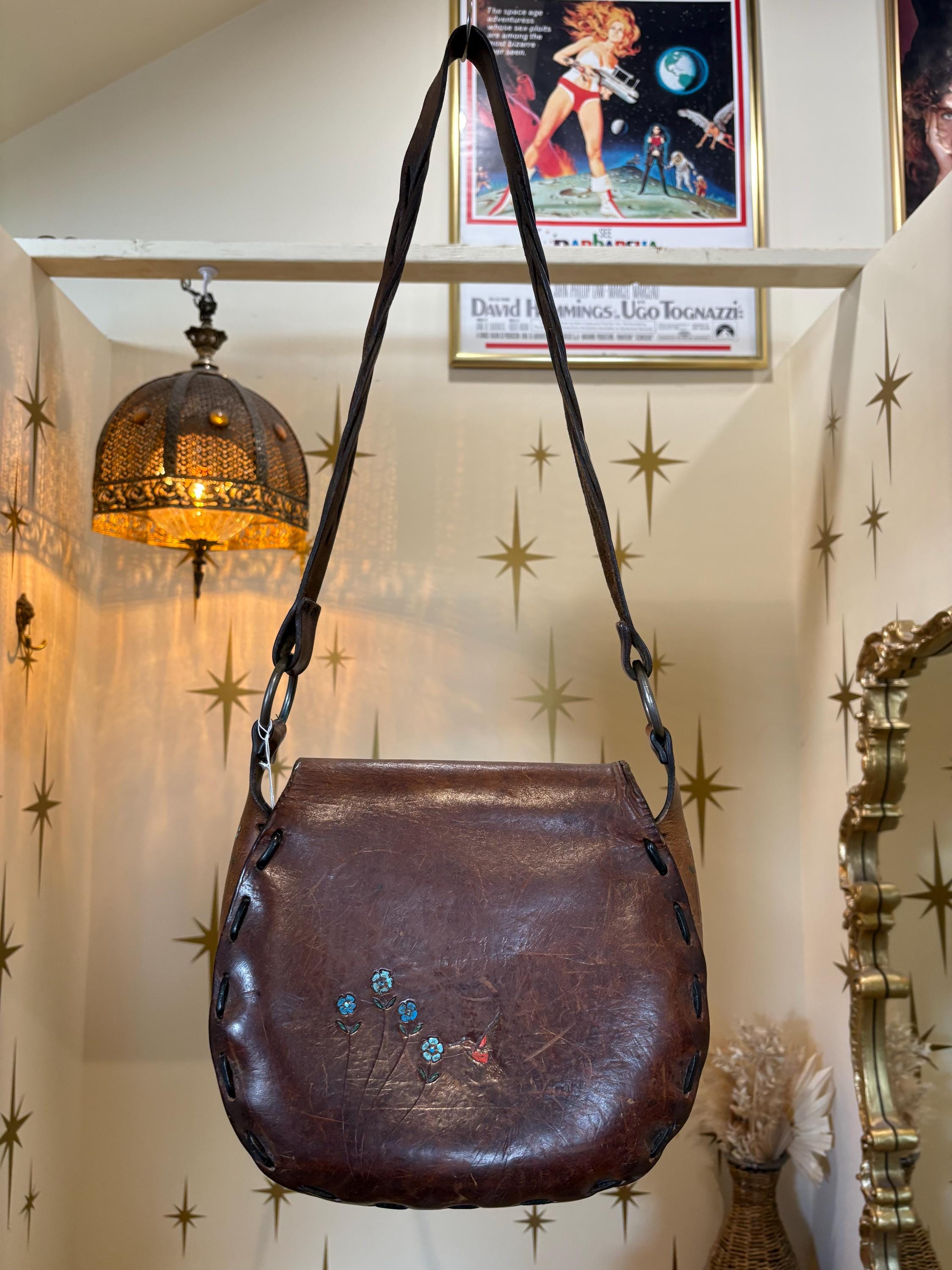 Very rare 1970s hand tooled purse with hand painted flowers and hummingbirds braided leather strap and spin lock. Amazing !!